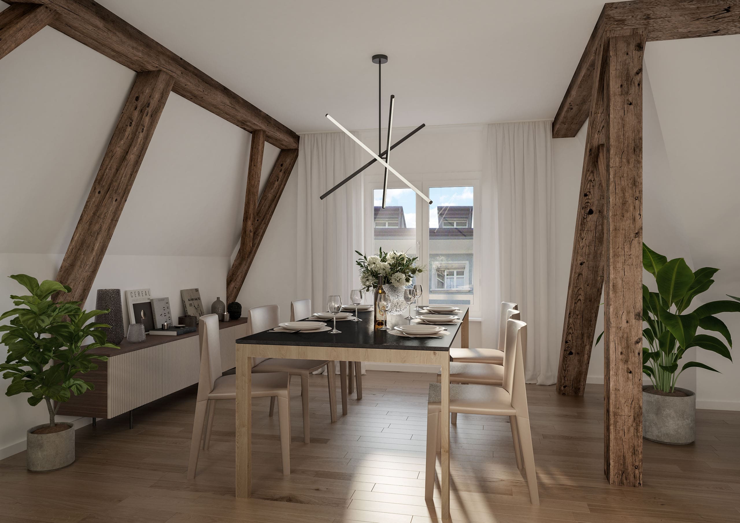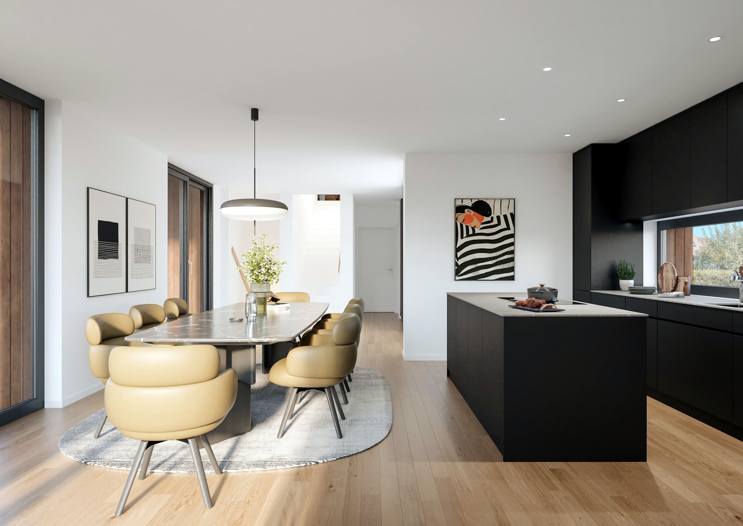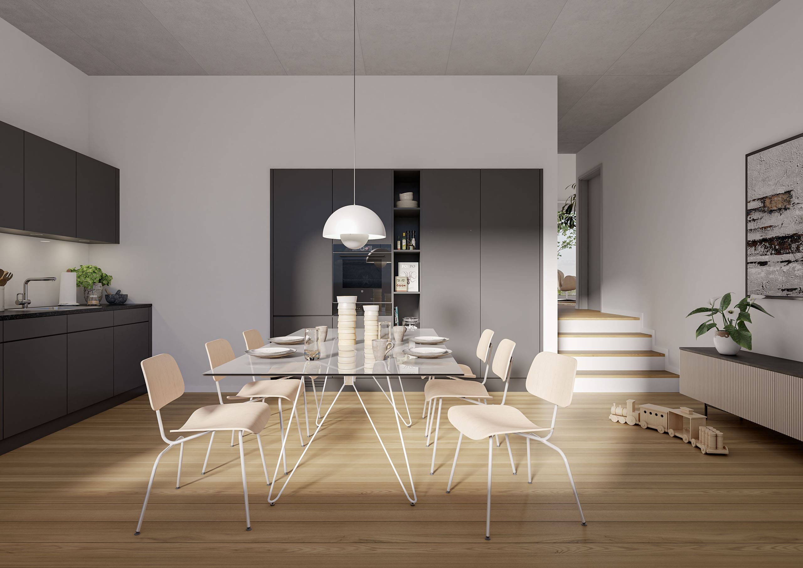 Zudem lassen sich Planmeetings virtuell von unterschiedlichen Standorten durchführen, wodurch der workflow ebenfalls vereinfacht wird. Architekten und Projektplaner können dabei alle Informationen über Virtual Reality teilen und Änderungen in Echtzeit vornehmen. Bei uns Architekturvisualisierungen professionell dargestellt. 3D Visualisierung günstig für moderne Bilder. STOMEO ist Ihr Partner für erstklassige Ansichten. Wir erstellen Visualisierungen, Innenraum Esszimmer, moderne Inneneinrichtung.