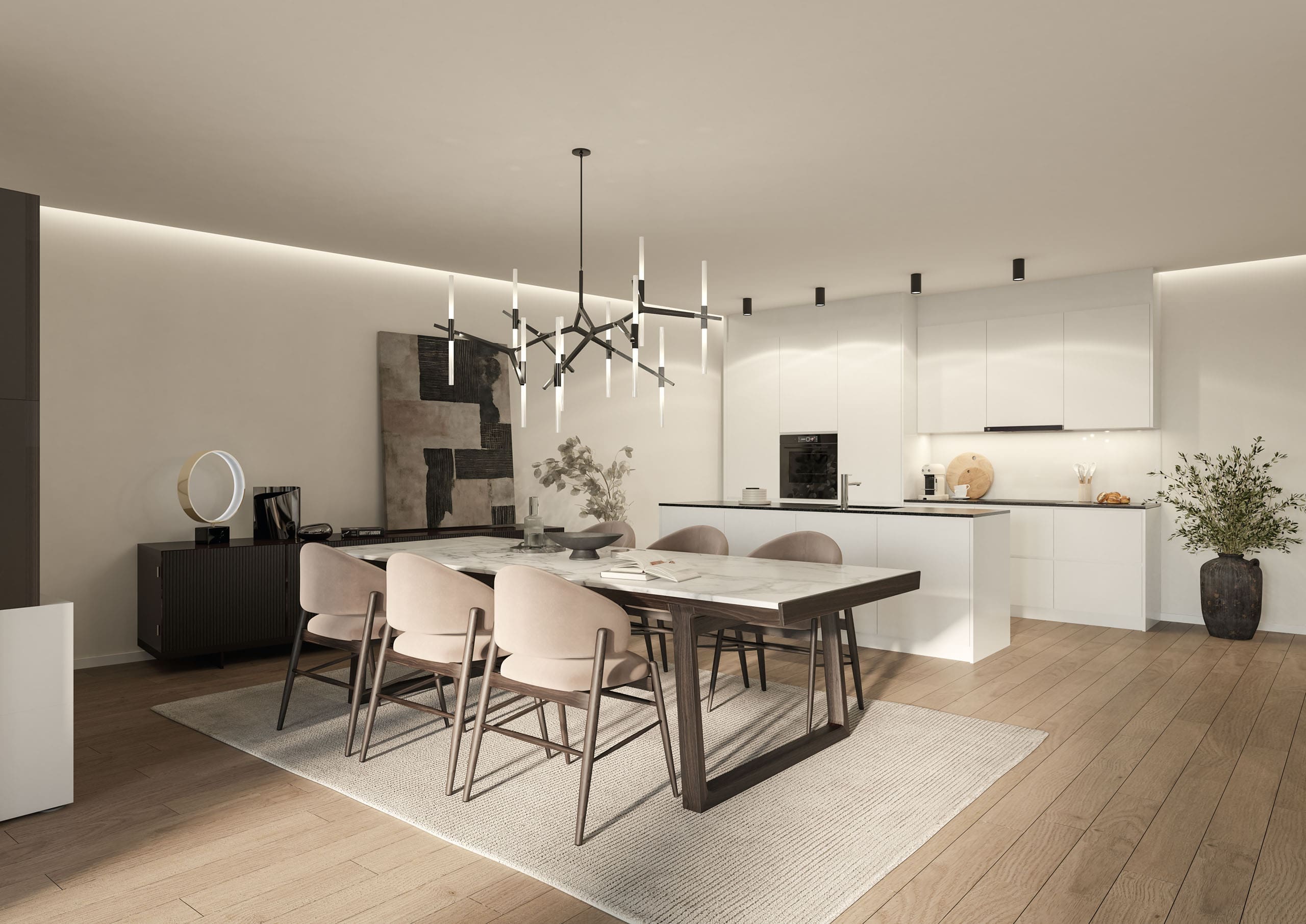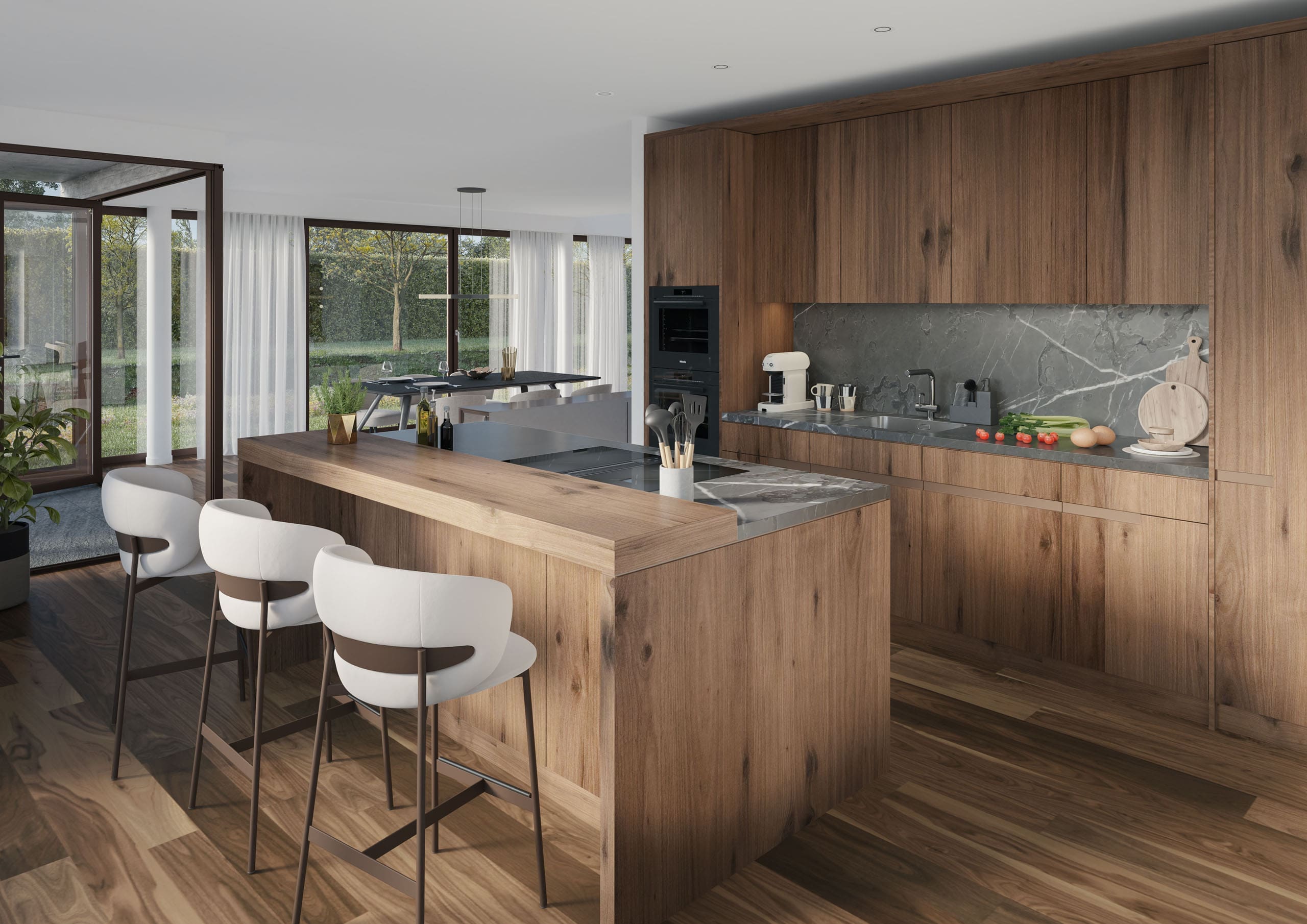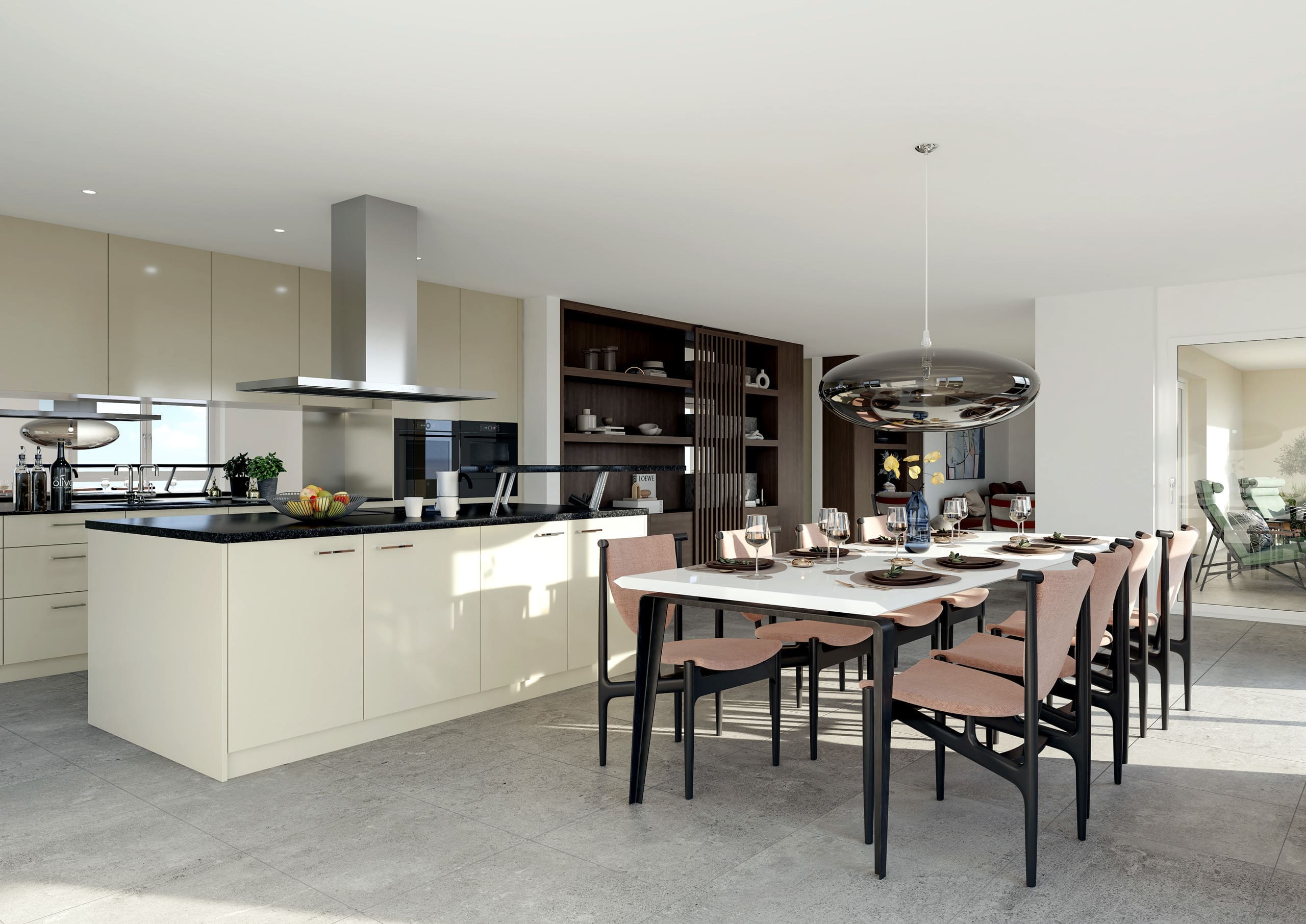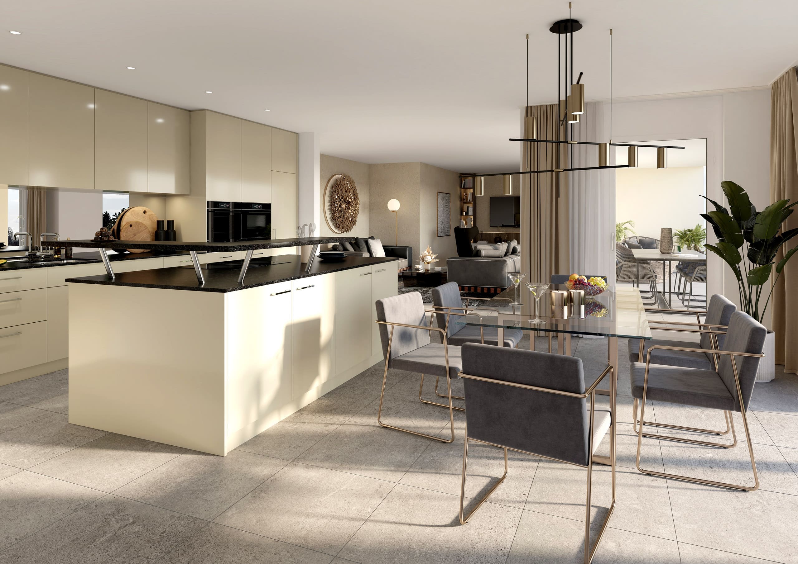 Fotorealistische Innenräume, Inneneinrichtung, Moderne Möbel, Kochinsel.