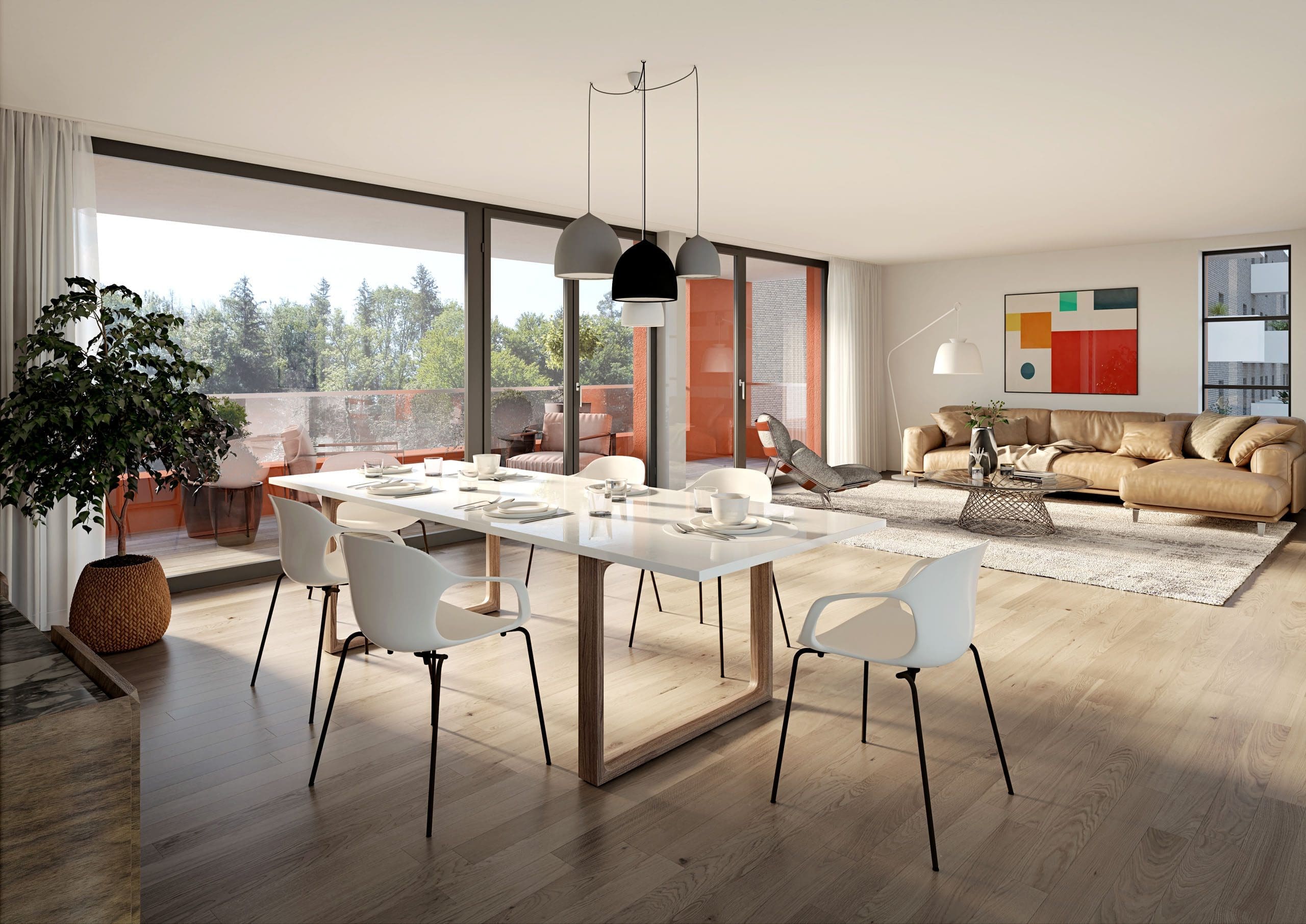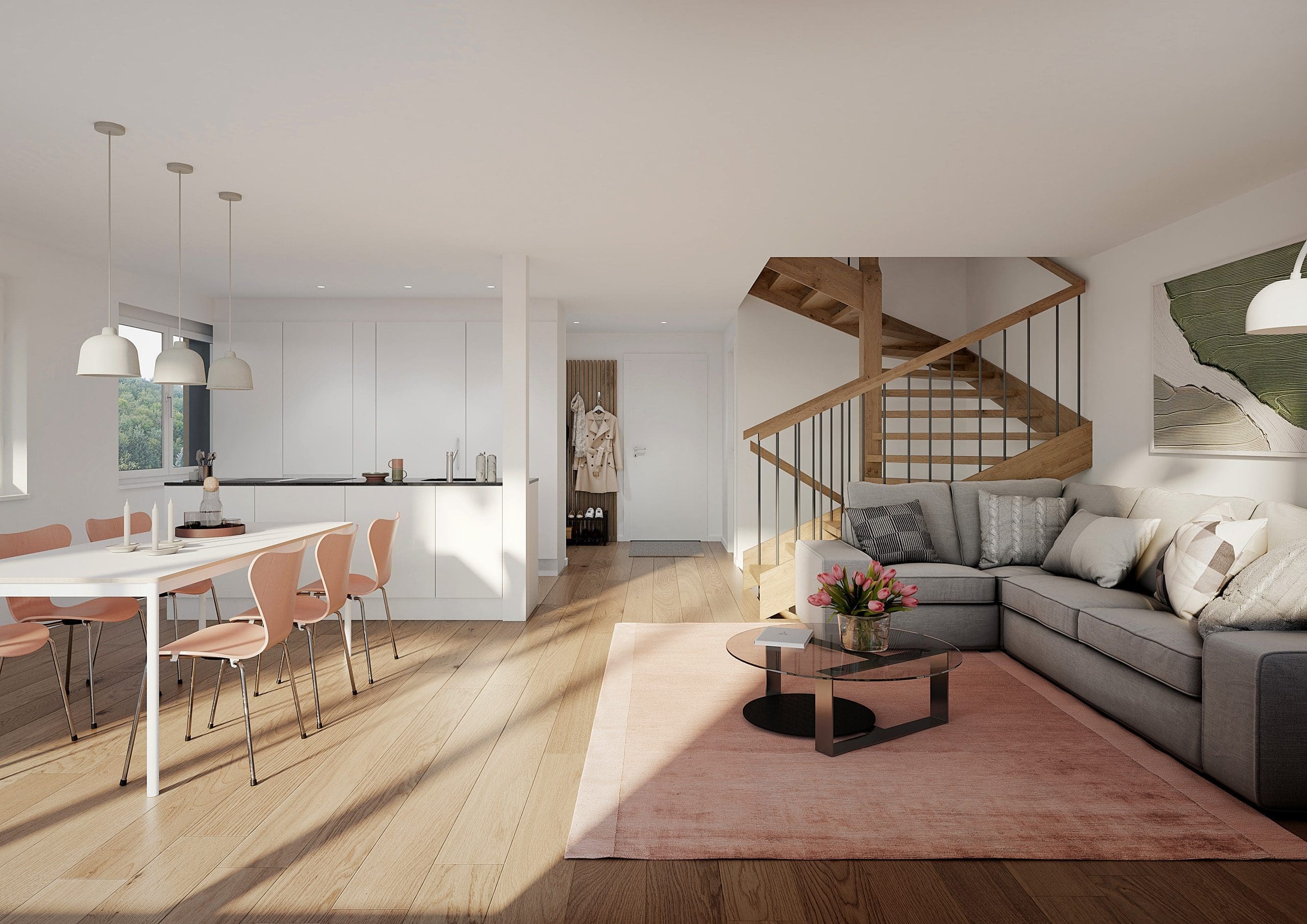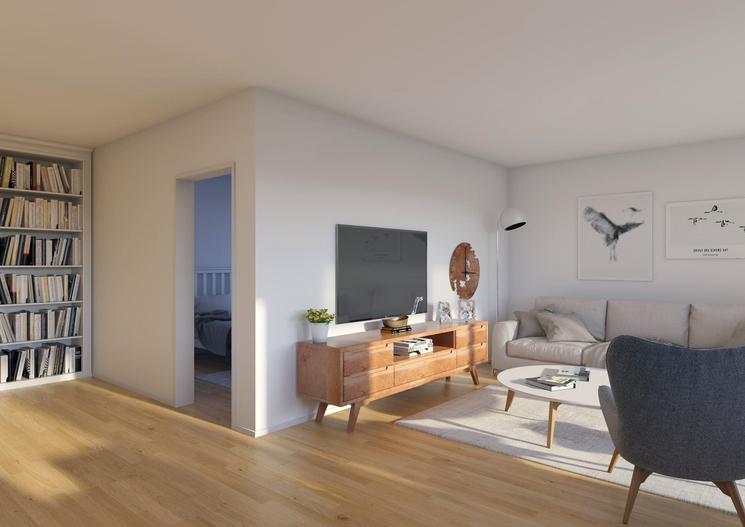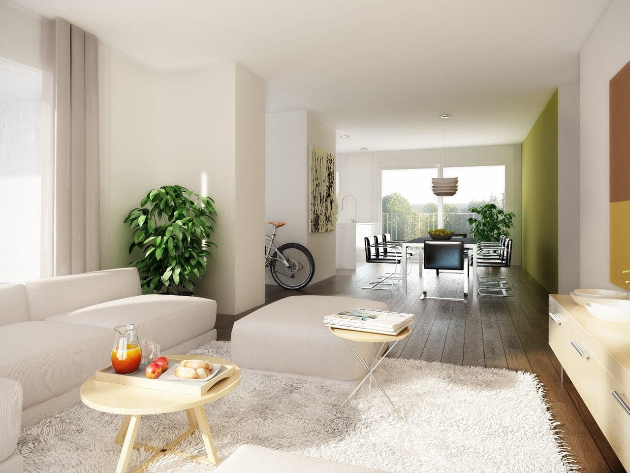 Visualisierung, Ansicht Innenraum, Innenperspektive, Innen Visualisierung Wohnraum, Render von Wohnung. Alle Ansichten werden von unseren Architekten durch eine hoch professionelle Interior Design Studie, mit exklusive moderne Möbel eingerichtet, bzw. dargestellt und als realistische Fotografien für Präsentationen und Immobilienpromotion direkt nach kurze Zeit am Kunde geliefert.